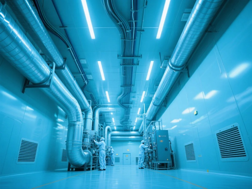本方案嚴格遵循ISO6級(千級)潔凈標準,采用模塊化潔凈室結構,以灰白色調為主,搭配防靜電高架地板與金屬壁板,打造高精度半導體生產環境。