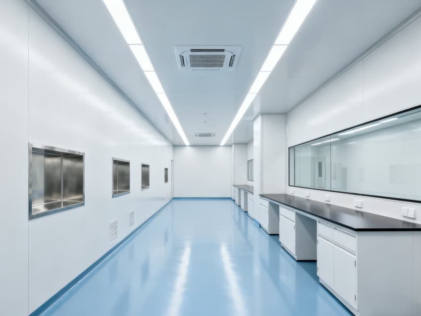 內(nèi)部6個(gè)實(shí)驗(yàn)室均為無設(shè)備空曠布局,按萬級(jí)潔凈標(biāo)準(zhǔn)建設(shè):地面鋪設(shè)無縫抗菌環(huán)氧自流平,墻面采用食品級(jí)不銹鋼潔凈墻板,陰陽角做R40圓弧處理杜絕積塵死角;柱網(wǎng)間距設(shè)為7.5米,預(yù)留實(shí)驗(yàn)臺(tái)、精密檢測(cè)設(shè)備安裝點(diǎn)位及運(yùn)維通道;頂部整合高效新風(fēng)過濾系統(tǒng)、恒溫恒濕裝置與防眩光LED照明,所有管線暗藏于吊頂內(nèi),最大化釋放空間高度與視野;實(shí)驗(yàn)室間通過通透玻璃隔斷銜接,進(jìn)一步強(qiáng)化整體空曠感,為藥物合成、質(zhì)量檢測(cè)等核心研發(fā)環(huán)節(jié)提供安全、潔凈的專屬環(huán)境。