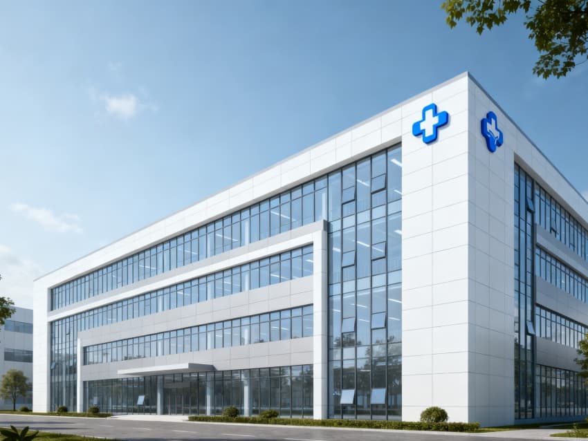 廠房外立面采用淺灰啞光潔凈涂料為主材,搭配雙層中空防紫外線玻璃,縱向線條規(guī)整簡(jiǎn)潔,主入口處嵌入簡(jiǎn)約的十字醫(yī)藥標(biāo)識(shí),弱化工業(yè)感的同時(shí)強(qiáng)化行業(yè)屬性;大面積玻璃幕墻引入柔和自然光,減少室內(nèi)人工照明能耗,整體呈現(xiàn)嚴(yán)謹(jǐn)、純凈的視覺質(zhì)感,契合醫(yī)藥研發(fā)的專業(yè)氛圍。?