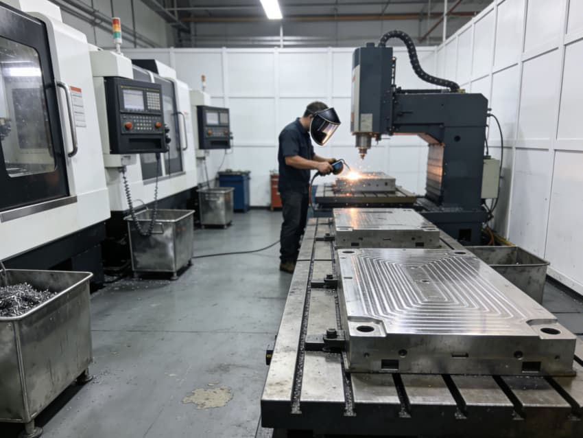 本廠房是一座集精密加工、質(zhì)量檢測(cè)、智能倉儲(chǔ)與設(shè)備運(yùn)維于一體的現(xiàn)代化生產(chǎn)基地,廠房核心加工區(qū)排布著多臺(tái)進(jìn)口 CNC 加工中心,采用多軸聯(lián)動(dòng)控制系統(tǒng),可實(shí)現(xiàn)復(fù)雜曲面、精密孔系的一體化加工,滿足微米級(jí)精度要求;一旁的特種加工工位上,技術(shù)人員正在進(jìn)行模具表面的精密焊接與打磨,為高難度工裝件提供定制化工藝支持。