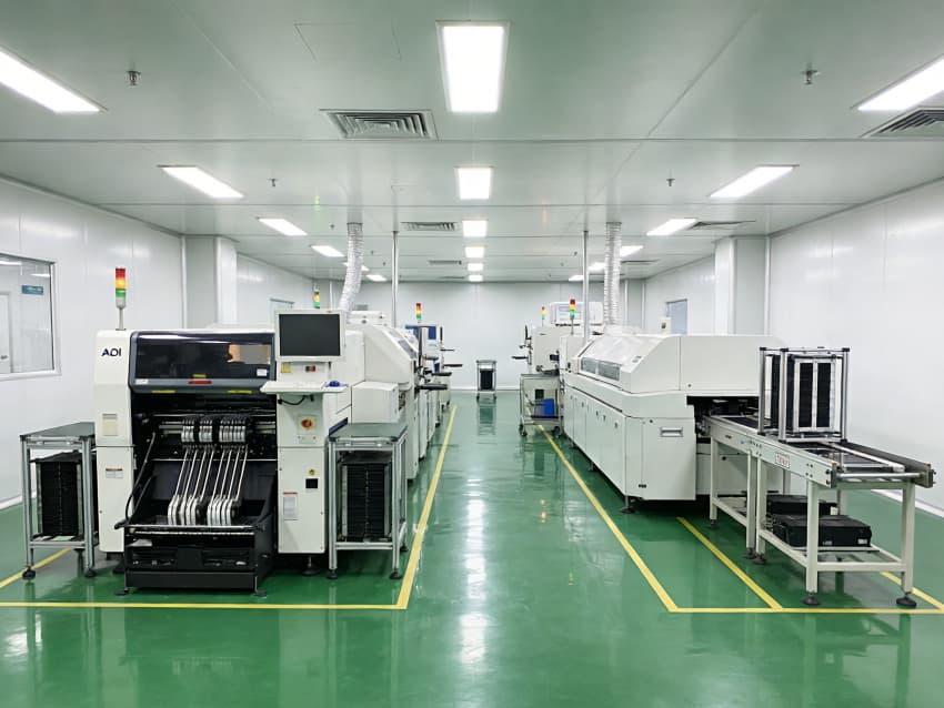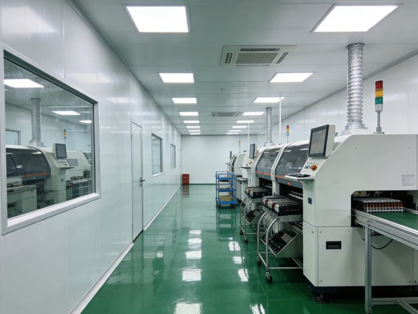 SMT 核心生產(chǎn)區(qū):針對高速貼片機(jī)、回流焊等設(shè)備做了地面承重加固與管線預(yù)埋,配置伸縮式通風(fēng)除塵管道,及時(shí)收集焊煙與粉塵;防靜電工作臺(tái)搭配 LED 工位燈,保障貼片、焊接的精度與效率。