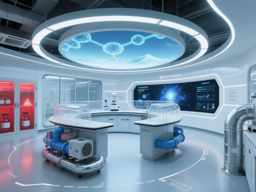 本實(shí)驗(yàn)室以"絕對(duì)環(huán)境控制"為核心設(shè)計(jì)理念,整體采用冰川藍(lán)與鈦白灰的漸變配色。墻面嵌入式環(huán)境參數(shù)監(jiān)測(cè)屏實(shí)時(shí)流動(dòng)著翡翠綠數(shù)據(jù)流,與頂棚矩陣排列的微孔送風(fēng)口形成科技韻律。核心實(shí)驗(yàn)區(qū)采用圓弧形防結(jié)露玻璃隔斷,內(nèi)置百級(jí)潔凈層流罩。地面鋪設(shè)防靜電陶瓷鋼板,接縫處嵌入LED環(huán)境達(dá)標(biāo)指示燈。設(shè)備區(qū)裸露的銀色保溫管道與藍(lán)色冷媒管構(gòu)成工業(yè)美學(xué)展陳,智能除濕機(jī)組通過(guò)半透明外殼展示內(nèi)部冷凝過(guò)程。數(shù)據(jù)中控室配備270°曲面監(jiān)控屏,懸浮粒子濃度以動(dòng)態(tài)星云圖呈現(xiàn)。空間通過(guò)嚴(yán)謹(jǐn)?shù)膸缀畏指钆c流體力學(xué)曲線結(jié)合,在極致環(huán)境控制要求下,打造出兼具科研嚴(yán)肅性與星際艙未來(lái)感的頂級(jí)實(shí)驗(yàn)環(huán)境。