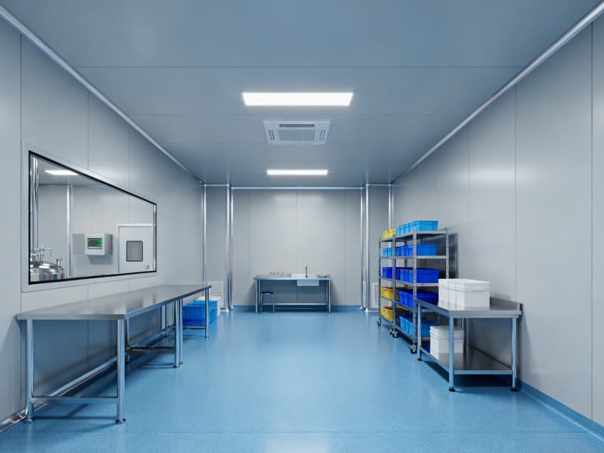 設計在環境防護上針對性突出:地面采用藍色耐腐環氧材質,可耐受酸堿類藥劑侵蝕,且無縫拼接設計便于清潔消毒;四周淺灰色抗菌墻壁采用防霉涂層處理,配合圓弧墻角結構,避免藥液殘留與粉塵堆積,搭配頂部層流送風系統,能穩定維持萬級潔凈度,滿足藥劑配液對微環境無菌性的嚴苛要求。