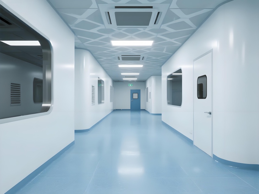 本車間空間以冰川藍與鈦白為主色調,弧形墻角與無縫地坪構成流暢的潔凈界面,頂部蜂窩狀FFU陣列形成科技感天花肌理。灌裝區透明亞克力防護罩展示自動化生產線運作,配合層流工作臺的紅色氣流可視化設計,強化無菌核心概念。功能模塊通過地面灰色導視帶串聯,設備區的鏡面不銹鋼與控制面板的藍色背光形成冷調光效。玻璃觀察窗嵌入電子壓差計,走廊的漸變光環境引導系統在滿足GMP動態監測要求的同時,營造出未來實驗室般的專業氛圍,緩解員工長時間密閉作業的疲勞感。