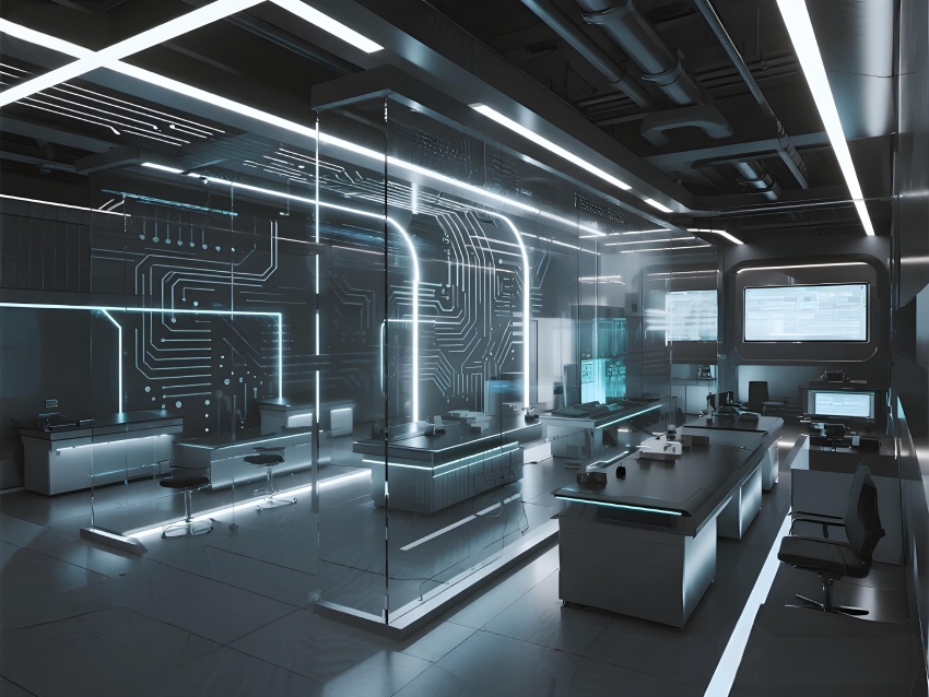 本實驗室采用"量子科技美學"設計,將納米尺度的精密感轉化為空間敘事。主實驗區以鏡面銀與深空灰為基調,半透明防輻射玻璃墻體內嵌電路板紋理光帶,象征微觀世界的電子軌跡。百級潔凈區的金色氣流箭頭與千級區的藍色光暈形成能級躍遷般的視覺分級,CVD設備艙的蜂窩狀散熱孔與懸浮式控制面板構成未來工廠意象。地面導光纖維模擬分子結構網絡,天花板動態粒子監測屏以數據流形式投射納米顆粒分布。通過冷調LED與設備熒光的層次照明,在滿足EMI屏蔽與化學防護需求的同時,創造出如同操作量子領域的沉浸式科研環境,透明氣閘門上的全息警示標志進一步強化尖端材料研究的科技儀式感。