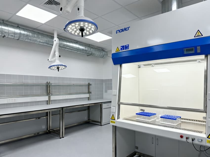 潔凈度執行分級標準:核心操作區達萬級(ISO8級),每立方米空氣中≥0.5μm微粒≤352000個;輔助區域為十萬級(ISO9級),通過初效-中效-高效三級空氣過濾系統,配合側送頂回氣流設計,實現每小時18-22次空氣置換。墻面采用耐酸堿潔凈彩鋼板,地面為防滑PVC無菌卷材,所有接縫密封處理;溫度穩定在22±2℃,濕度控制在45%-55%,關鍵區域維持微負壓,有效避免試劑交叉污染與有害氣體擴散,完全符合生化實驗室建設規范。