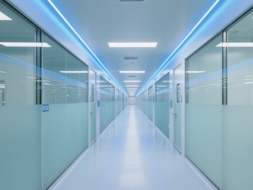 該醫藥廠潔凈車間以冰川白與醫用藍的漸變配色為主調,營造出純凈無菌的空間氛圍。墻面采用一體化抗菌板材,從頂部冰川白向地面醫用藍自然過渡,既符合GMP視覺規范,又強化了潔凈認知。?
