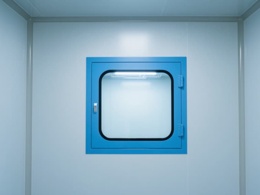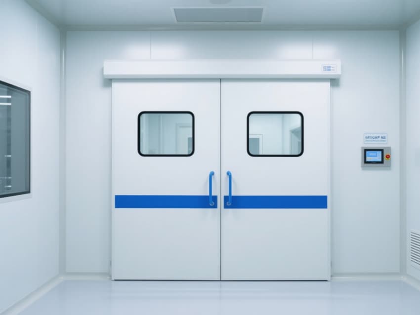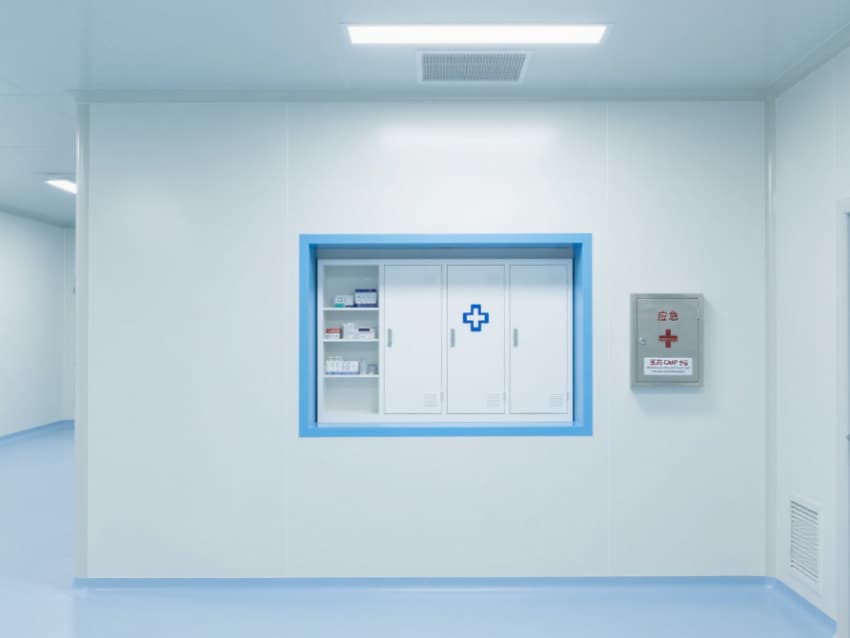 走廊與操作區通過玻璃隔斷分隔,門框與墻角均做圓角處理,配備嵌入式不銹鋼傳遞窗。地面標識線采用醫用藍啞光材質,指引動線的同時避免反光干擾,整體空間雖無設備,卻通過細節設計全方位展現醫藥生產的嚴苛潔凈要求。