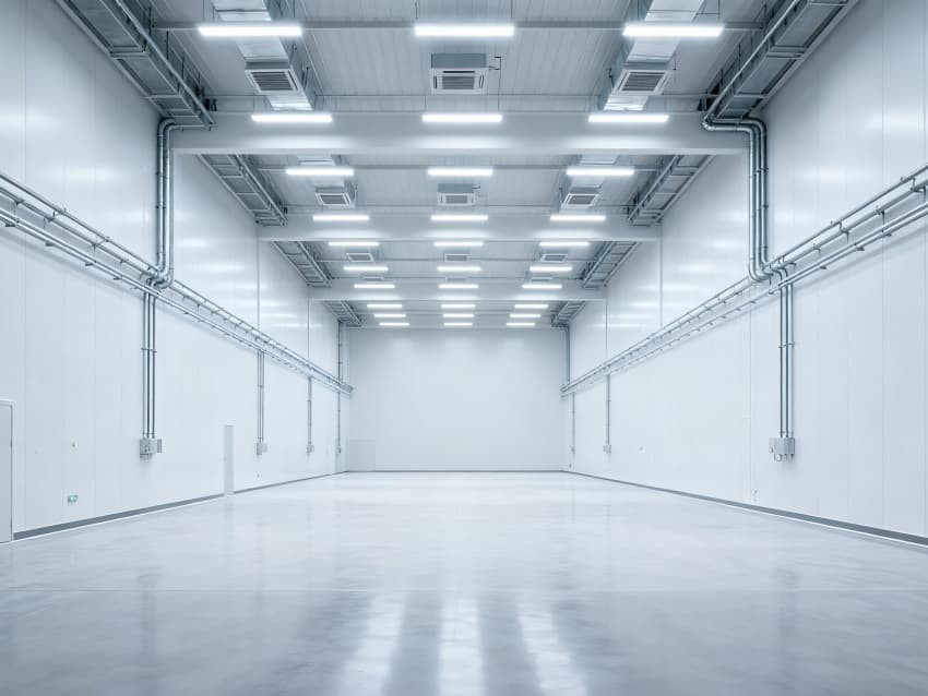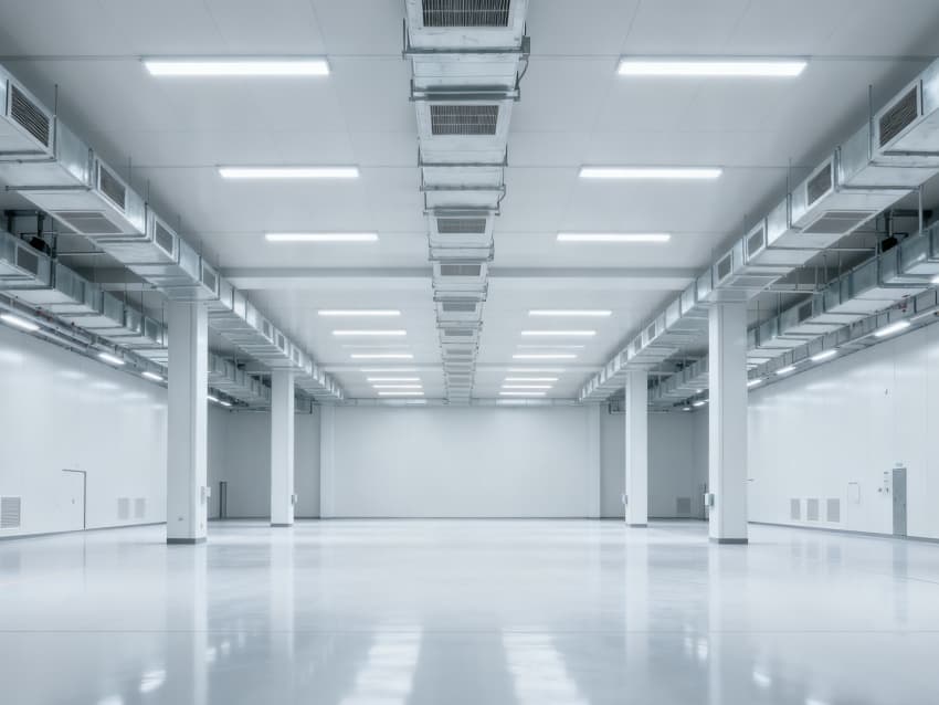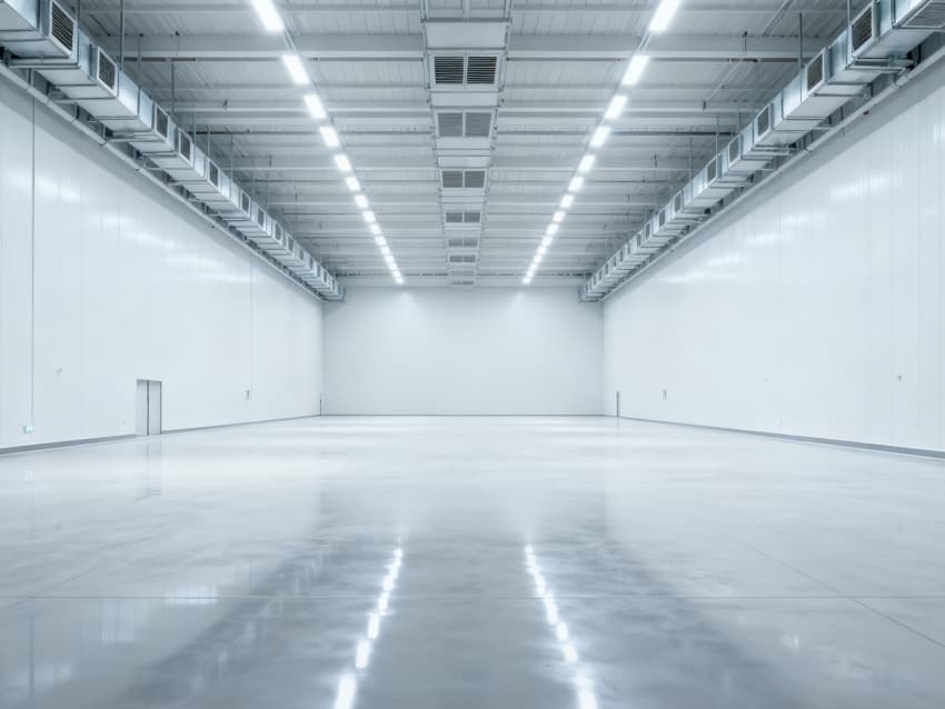 內部6個生產車間均為無設備空曠布局,按工業級潔凈與承重標準建設:地面鋪設耐磨防靜電環氧地坪,墻面采用白色環保潔凈墻板,陰陽角做圓弧處理減少積塵;柱網間距達10米,預留設備安裝與物流通道空間;頂部整合恒溫恒濕新風系統與節能LED照明,管線暗藏于吊頂內,避免空間雜亂;車間之間通過通透玻璃隔斷銜接,進一步強化整體空曠感,為新能源產品規?;a、柔性產線調整提供高效、潔凈的空間支撐。