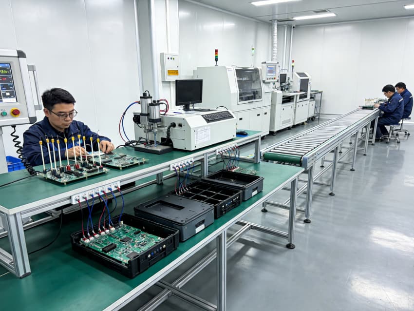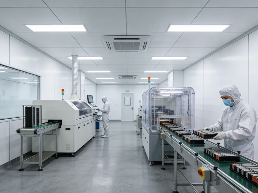 手工組裝與測試區(qū):采用模塊化防靜電工作臺布局,每個工位配備獨立電源接口與靜電手環(huán)接地端,線性燈帶提供均勻照明,旁側(cè)通風(fēng)系統(tǒng)有效驅(qū)散焊接產(chǎn)生的熱量與煙塵。