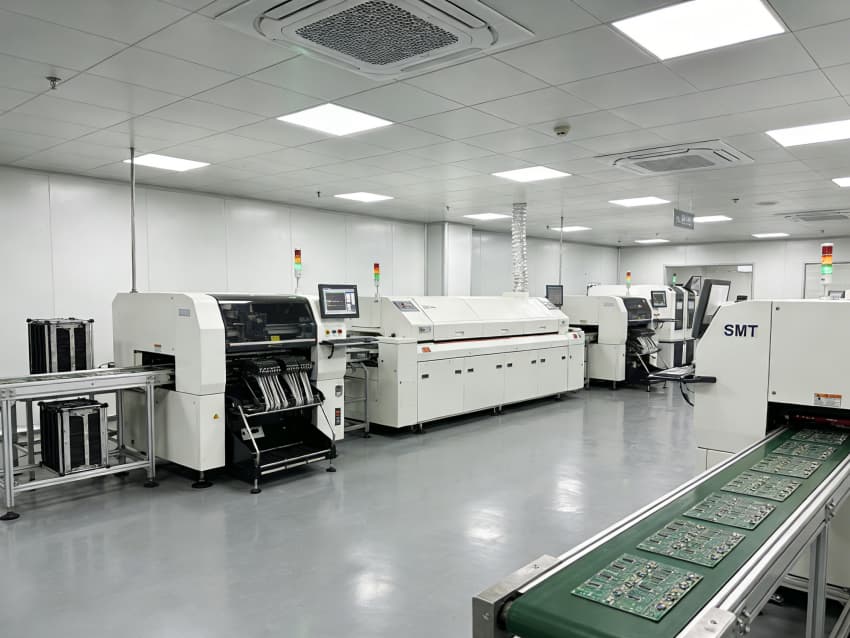 SMT 核心生產(chǎn)區(qū):針對高速貼片機、回流焊等設(shè)備做了地面承重加固與管線預(yù)埋,配置伸縮式通風(fēng)除塵管道,及時收集焊煙與粉塵;防靜電工作臺搭配 LED 工位燈,保障貼片、焊接的精度與效率。