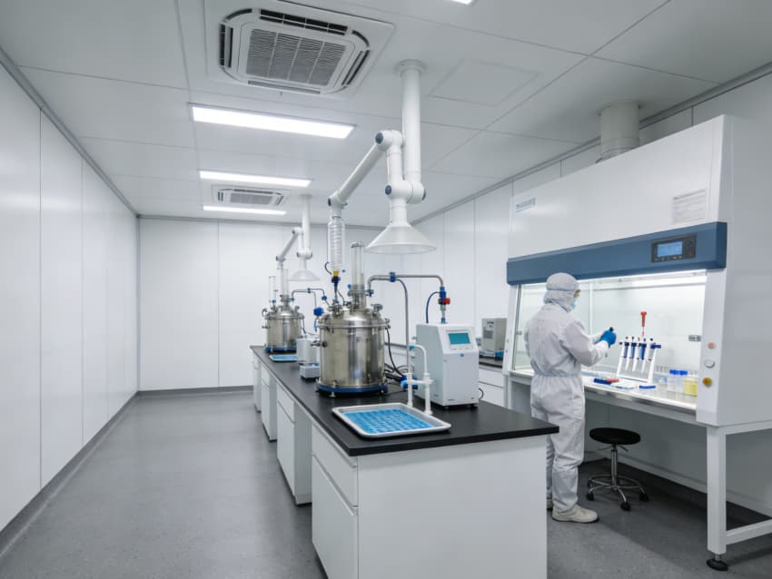 白色墻面采用食品級潔凈抗菌涂層,推行無縫拼接工藝,陰陽角圓弧倒角設(shè)計消除清潔死角,潔凈度可達Class 7級標(biāo)準(zhǔn)。車間科學(xué)劃分抗體表達區(qū)、偶聯(lián)反應(yīng)區(qū)、純化區(qū)等功能區(qū)域,各區(qū)域配備獨立層流凈化與負(fù)壓防護系統(tǒng),偶聯(lián)區(qū)預(yù)留精密溫控與惰性氣體接口,純化區(qū)設(shè)置無菌物料傳遞窗口,全方位規(guī)避交叉污染,保障研發(fā)生產(chǎn)的安全性與合規(guī)性。