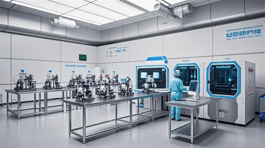 機(jī)械人研發(fā)實(shí)驗(yàn)室,未來(lái)科技風(fēng)格。實(shí)驗(yàn)室分為研發(fā)區(qū)、測(cè)試區(qū)、裝配區(qū)和辦公區(qū)。研發(fā)區(qū)占50%,測(cè)試區(qū)占30%,裝配區(qū)占10%,辦公區(qū)占10%。研發(fā)區(qū):防靜電環(huán)氧地坪(淺灰色),