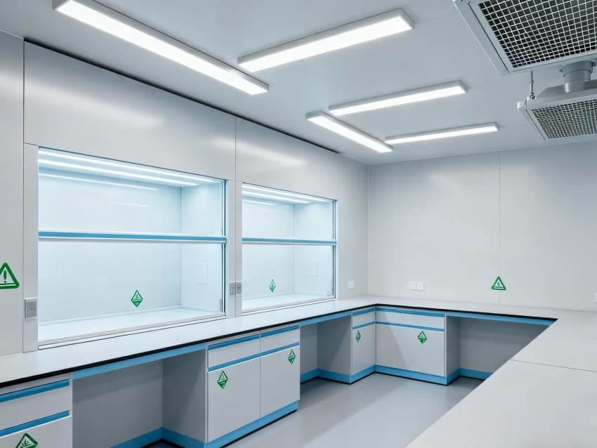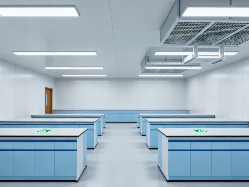 在核心操作區(qū)域,我們執(zhí)行的是高標(biāo)準(zhǔn)的潔凈要求,每立方米空氣里直徑0.5微米以上的灰塵、顆粒等雜質(zhì)不能超過352000個(gè),相當(dāng)于達(dá)到了萬級(jí)潔凈標(biāo)準(zhǔn)(國際ISO8級(jí))。而像走廊、儲(chǔ)物間這些輔助區(qū)域,要求會(huì)稍微低一些,執(zhí)行的是十萬級(jí)潔凈標(biāo)準(zhǔn)(國際ISO9級(jí))。采用初效-中效-高效三級(jí)空氣過濾系統(tǒng),配合側(cè)送頂回氣流設(shè)計(jì),實(shí)現(xiàn)每小時(shí)18-22次空氣置換;墻面選用耐酸堿潔凈彩鋼板,地面為防滑PVC無菌卷材,所有邊角做圓弧密封處理,減少清潔死角。室內(nèi)溫度穩(wěn)定在22±2℃,相對濕度控制在45%-55%,關(guān)鍵實(shí)驗(yàn)區(qū)維持微正壓,有效隔絕外界污染與交叉感染,既符合高校生物實(shí)驗(yàn)教學(xué)規(guī)范,也為科研數(shù)據(jù)準(zhǔn)確性提供可靠環(huán)境保障。
