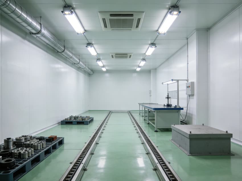 車間內部施工工藝凸顯工業適配性:地面采用淺綠色防油耐磨環氧地坪工藝,經基層固化處理、環氧砂漿找平、耐磨骨料撒布、罩面封閉四道核心工序,表面平整度誤差≤0.8mm/m,抗壓強度達C30以上,可耐受設備碾壓與油污侵蝕;墻面采用白色工業級潔凈涂層施工,推行無縫拼接技術,陰陽角采用R40圓弧倒角工藝,杜絕積塵死角,涂層附著力強,可耐受高頻次清潔與工業粉塵侵蝕。