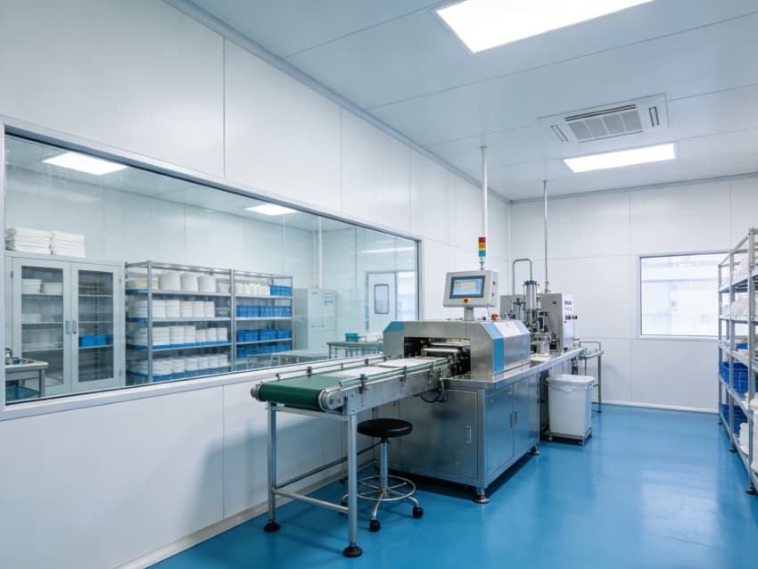 墻面與頂板選用抗菌型潔凈彩鋼板,搭配圓弧角收邊與硅酮密封膠條,徹底消除積塵死角,便于日常消毒清潔;觀察窗采用雙層防爆玻璃,既保障工藝可視性,又強化生產安全。